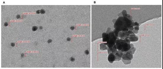 透射電子顯微鏡下,單個原生ZnO納米顆粒放大10萬倍(A),聚集ZnO納米顆粒放大30萬倍(B)。