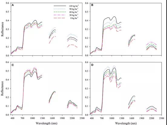 5種氮肥速率下龍爪稷的平均冠層反射率,分別于種植后(A)38、(B)46、(C)52和(D)76天取樣。
