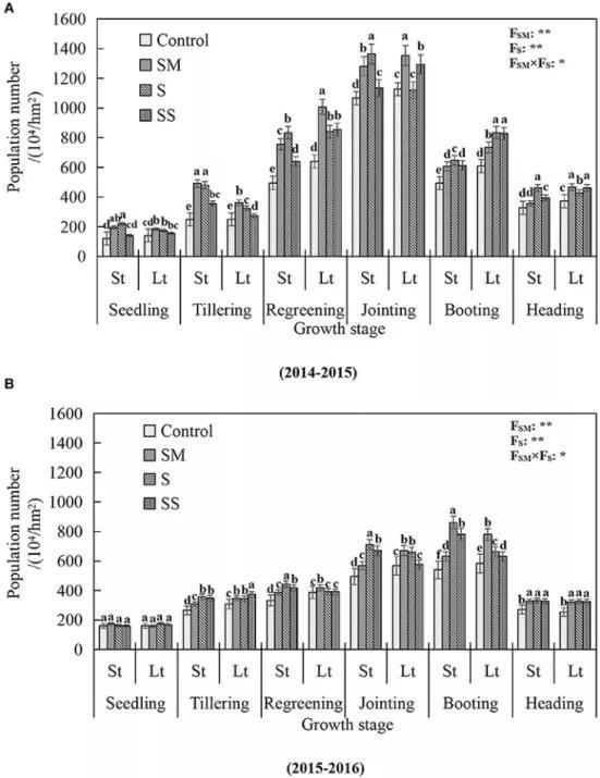 1、不同年份中對照組、SM、S、SS處理下小麥不同生長階段的數(shù)量