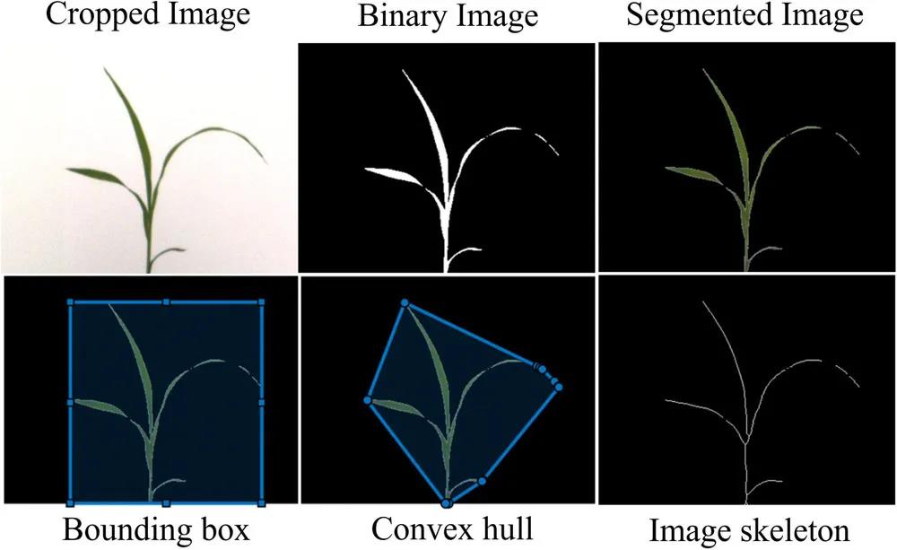 PhenoImage使用的不同特征的表示。在選擇感興趣的區(qū)域之后,從原始圖像導(dǎo)出裁剪圖像。二進(jìn)制圖像是植物像素的遮罩,其中植物像素被設(shè)置為1,背景被設(shè)置為0。分割的圖像表示來自背景的分割的植物像素。以淺藍(lán)色顯示的邊界框是基于分割的像素計(jì)算的,并包圍植物的所有像素。凸包表示包圍植物所有像素的最小凸多邊形。圖像骨架近似于莖和葉的中心線,并且使用骨架化算法來計(jì)算