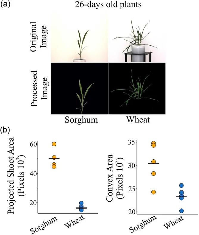 PhenoImage驗(yàn)證。(a)在充分澆水條件下生長(zhǎng)的26天的高粱和小麥植株的原始和處理過的RGB圖像。(b)利用表型圖像(PhenoImage)得到了兩個(gè)數(shù)字特征:凸面積(凸面面積)和投射莖面積(PSA),它們代表了植物的結(jié)構(gòu)。每個(gè)點(diǎn)代表單株復(fù)制,水平線代表組均值。高粱(n = 5)和小麥(n = 6)在數(shù)字性狀上均存在顯著差異(P < .001)。對(duì)于統(tǒng)計(jì)數(shù)據(jù),使用Welch's t檢驗(yàn)(方差相等而非假設(shè))