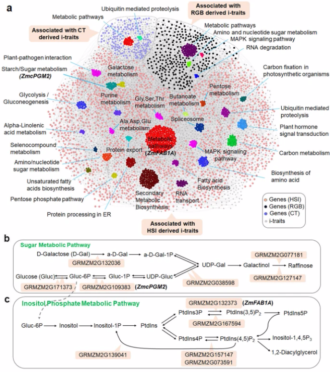 圖2.玉米干旱脅迫響應圖像性狀i-traits的遺傳解析。a.基因和圖像性狀i-traits的關聯(lián)網(wǎng)絡;b.候選基因在糖代謝通路富集;c.候選基因在磷酸肌醇代謝通路富集。