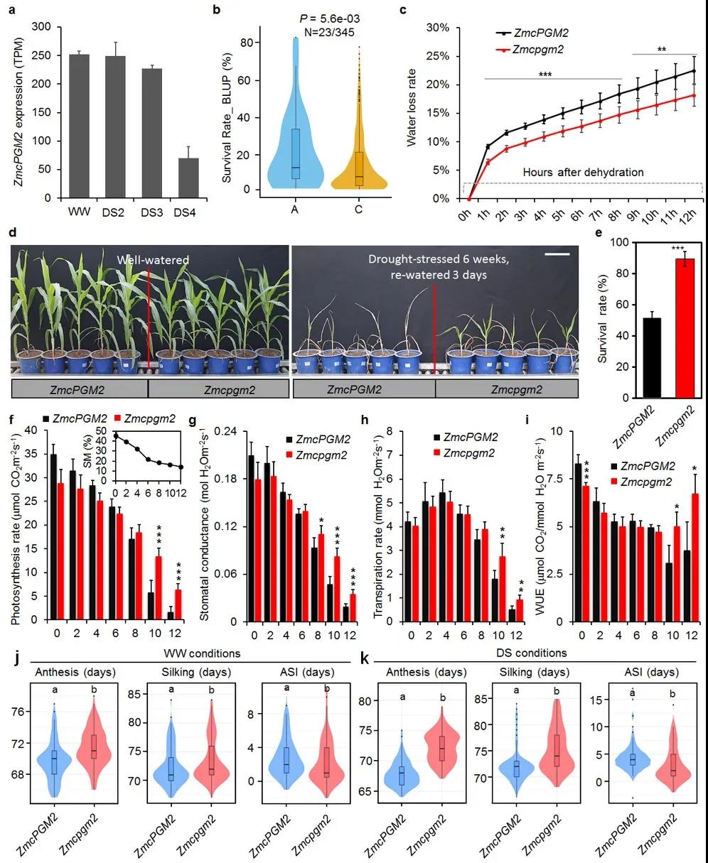 圖3.候選基因ZmcPGM2的抗旱功能驗證。a. ZmcPGM2在不同干旱脅迫下的表達分析;b.單倍型分析;c.突變體和野生型葉片失水率比較;d-e.突變體和野生型干旱脅迫下存活率比較;f-i.突變體和野生型干旱脅迫下光合表型比較;j-k.突變體和野生型在正常澆水和干旱脅迫下花期表型 (ASI) 比較。