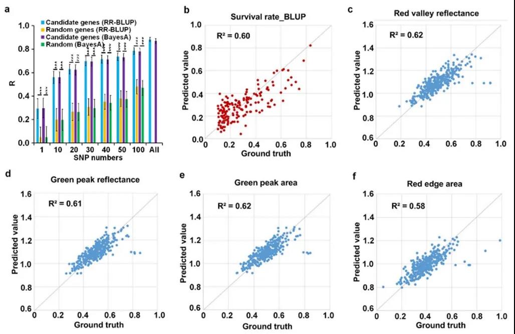 圖4. 候選基因和圖像性狀i-traits預測玉米存活率。a.利用全基因組選擇模型對玉米存活率進行預測;b.利用15個圖像性狀i-traits預測玉米存活率;c-f. 15個圖像性狀預測4個光譜指數(shù)。